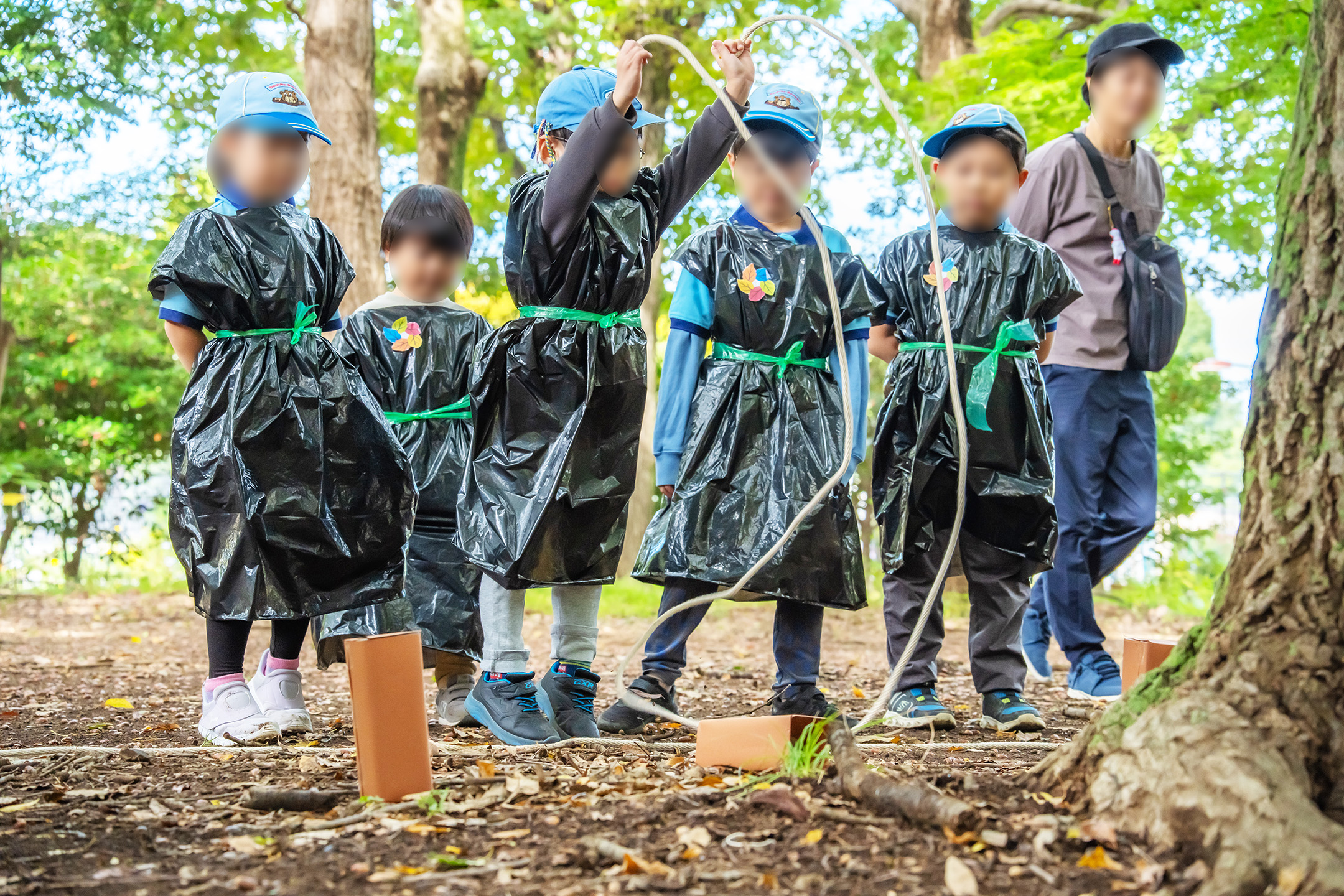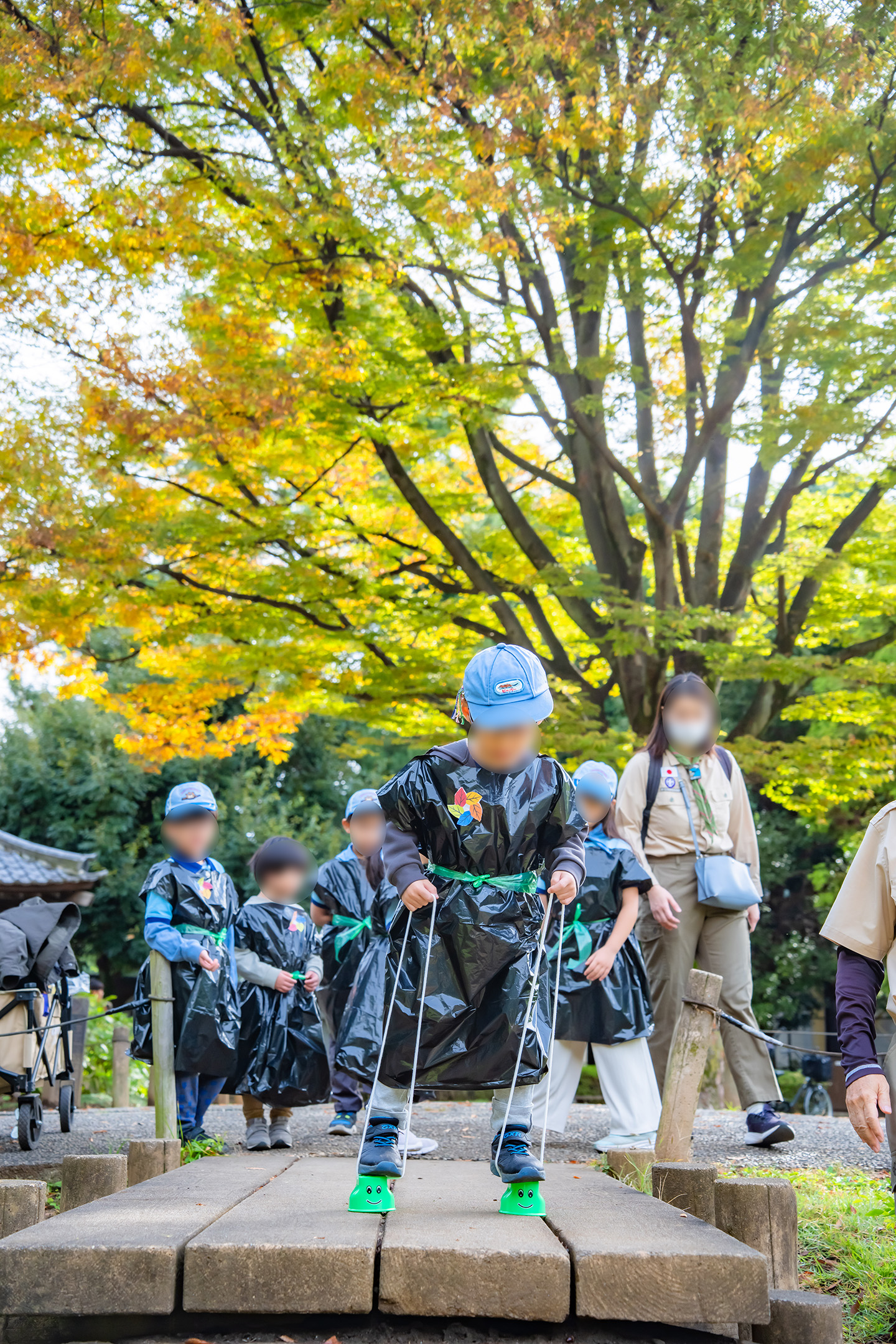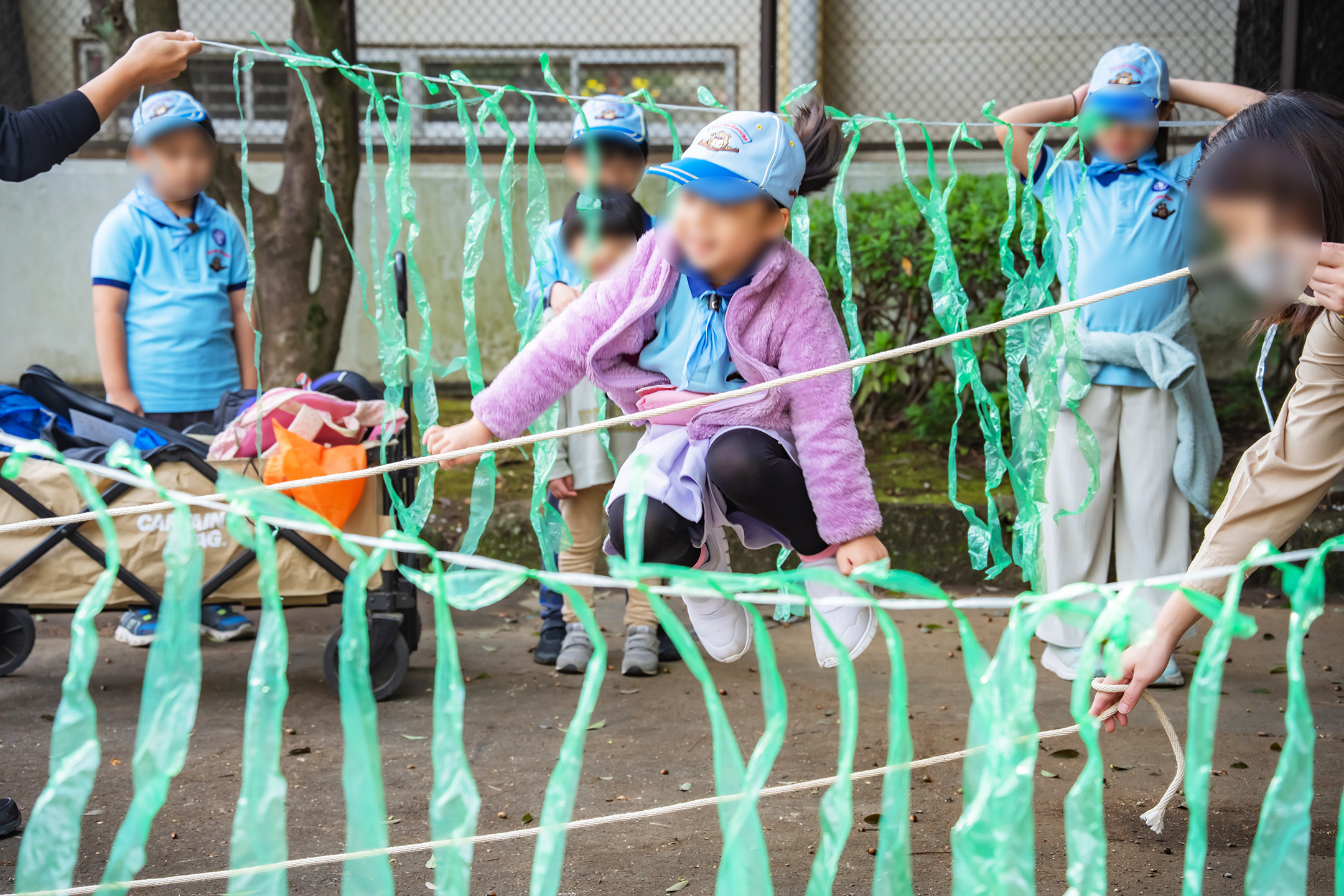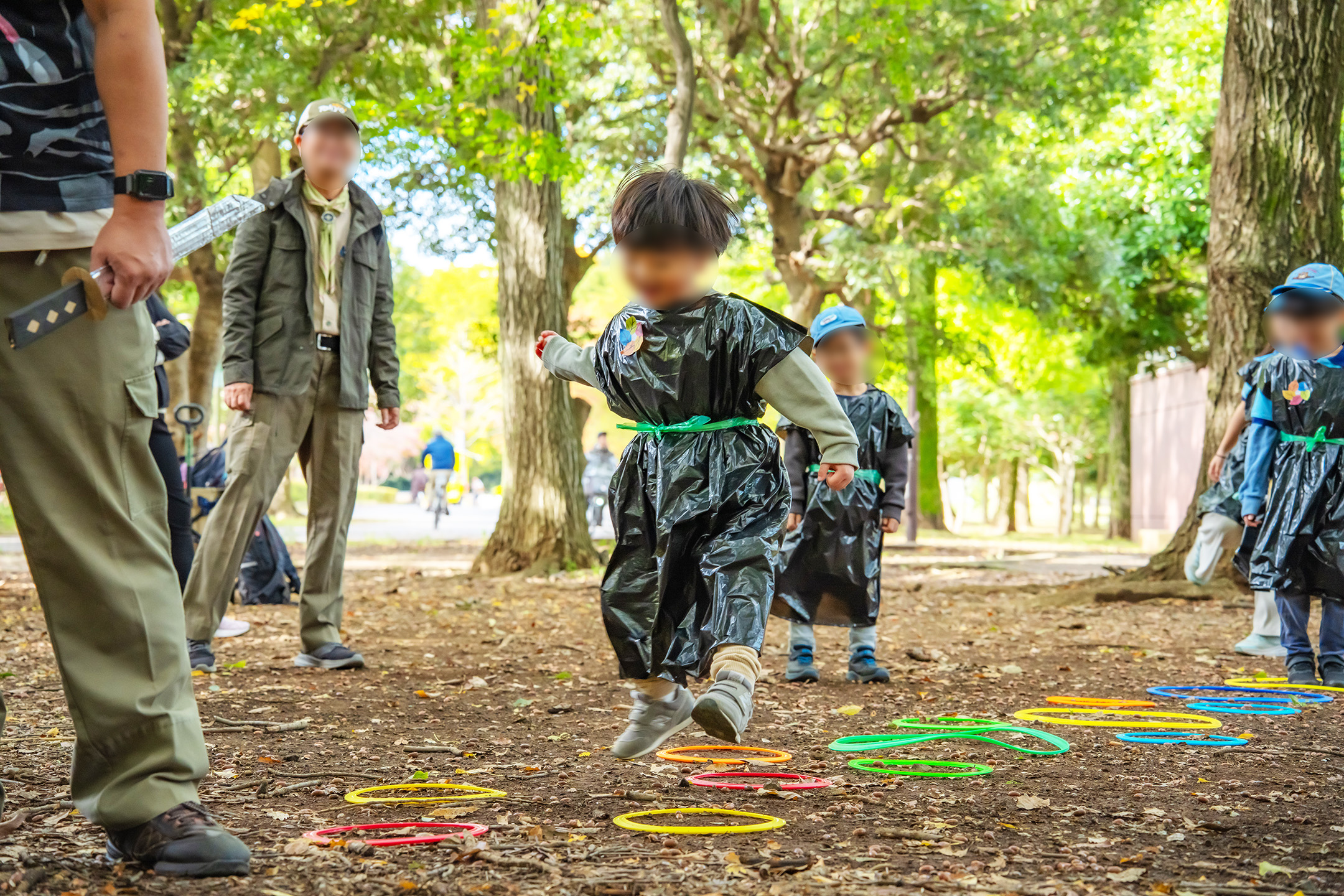 段差のある縄をジャンプ、リンボーし、昔にタイムスリップです。そして黒マントをまとい、かわいらしい忍者に変身です。