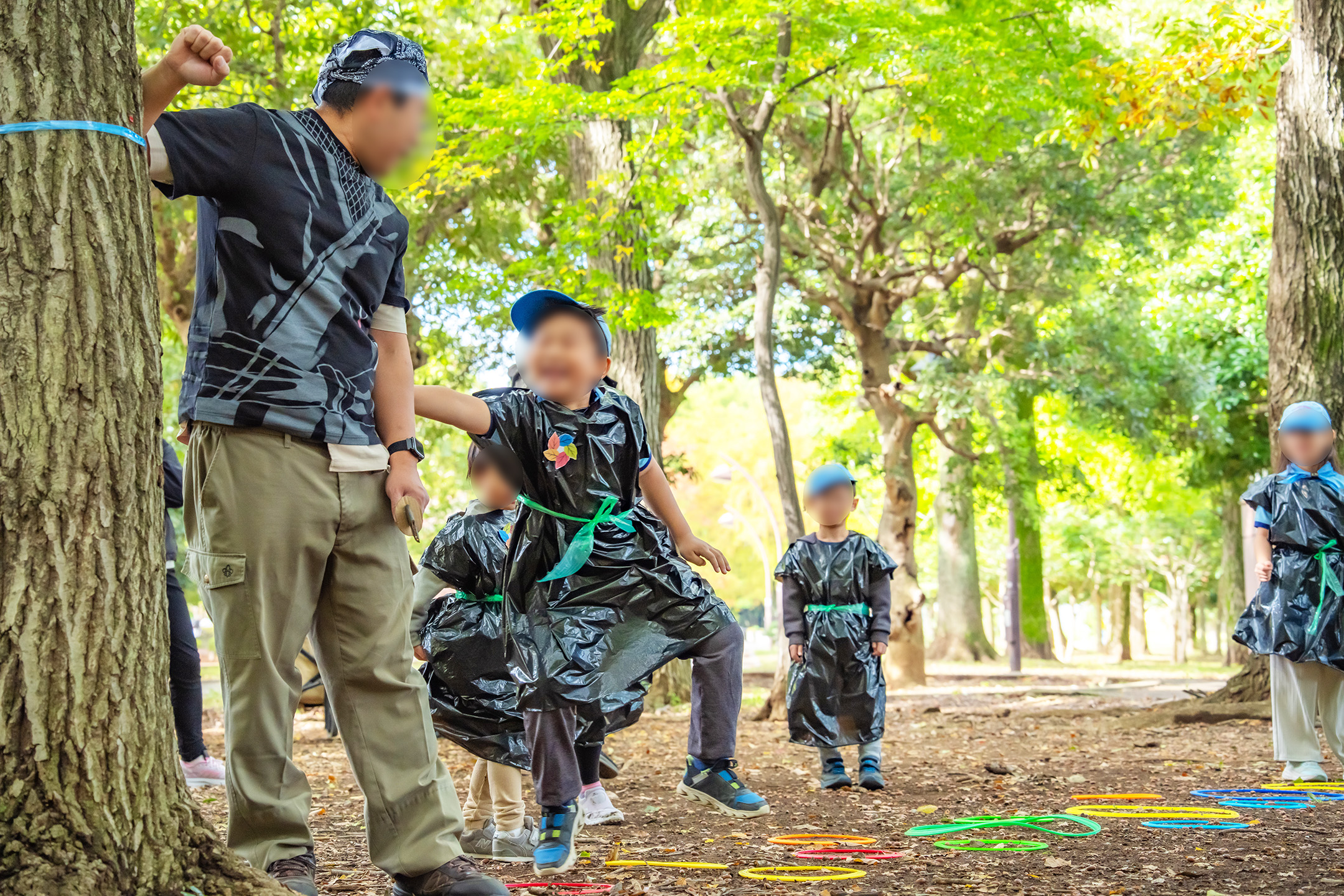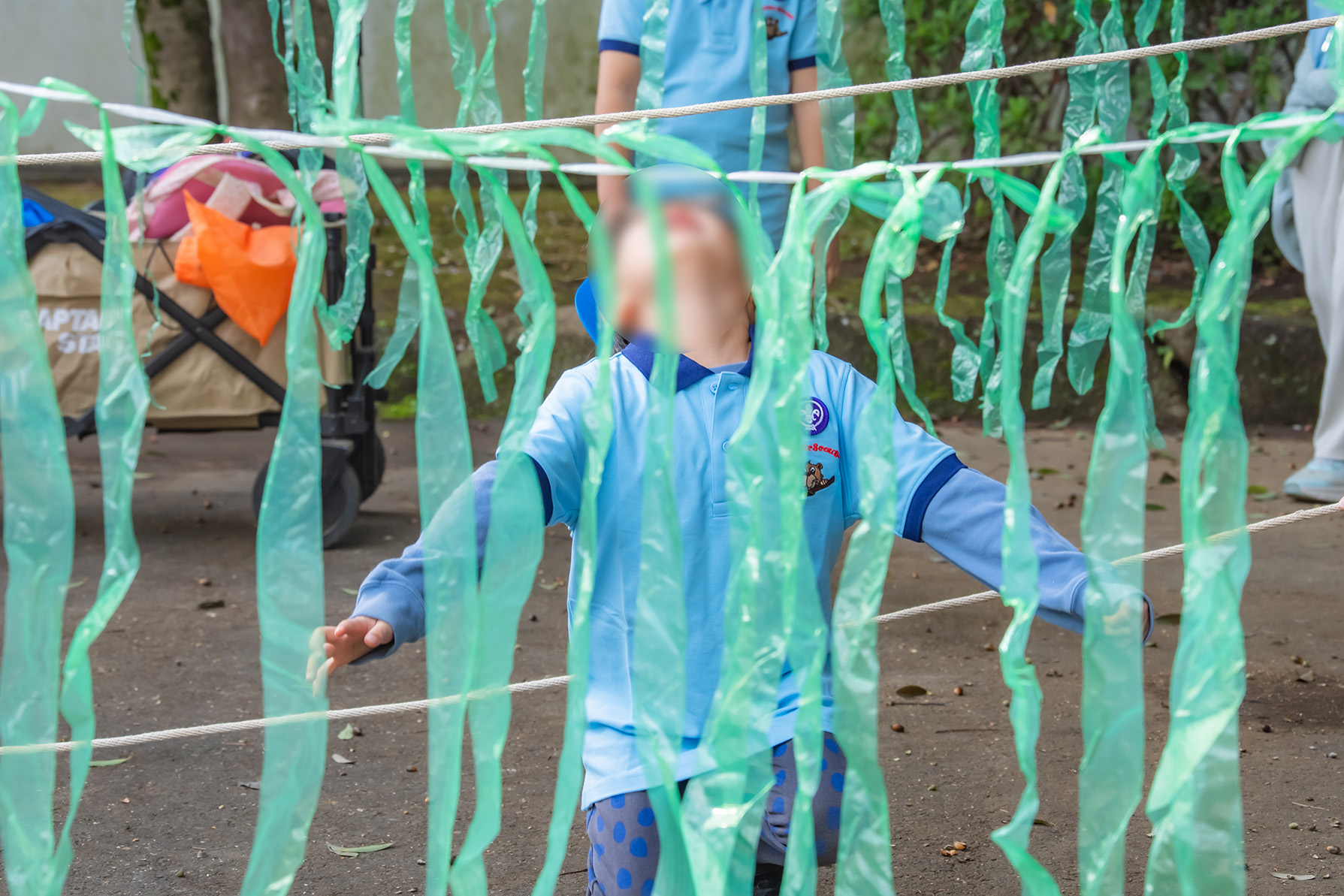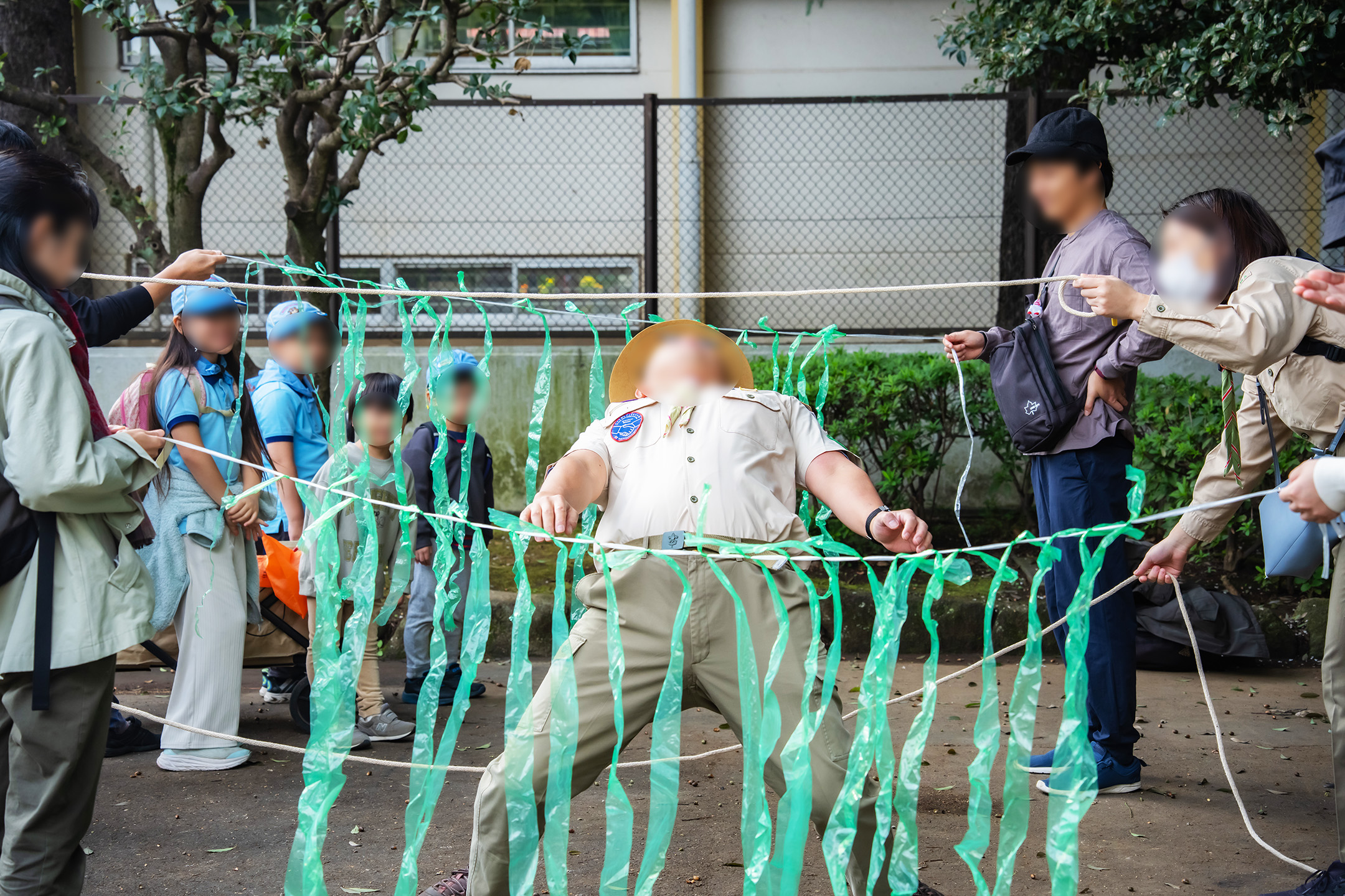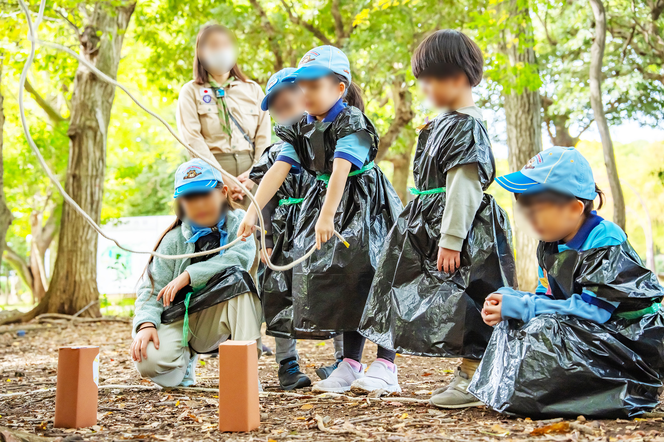 段差のある縄をジャンプ、リンボーし、昔にタイムスリップです。そして黒マントをまとい、かわいらしい忍者に変身です。