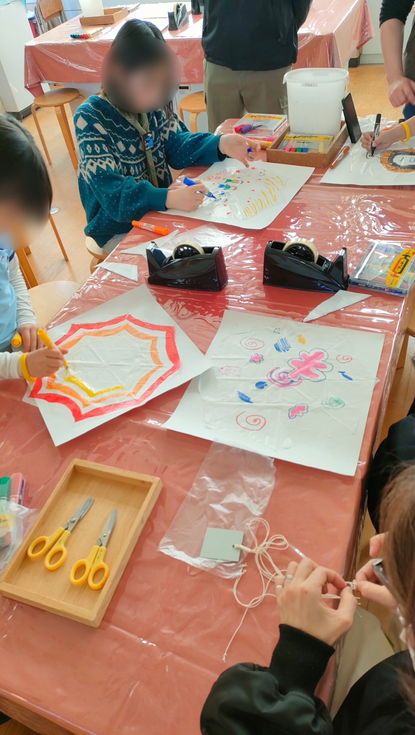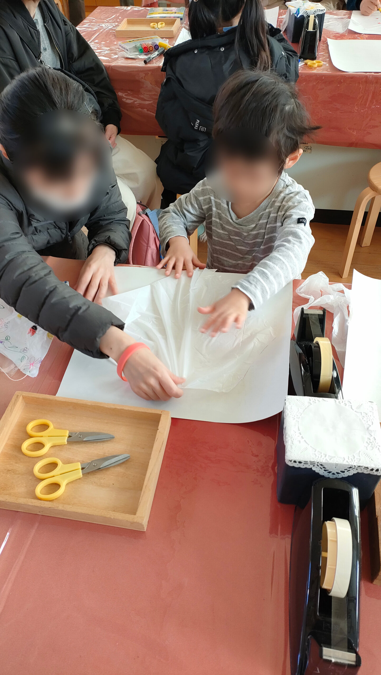 ビーバー隊ももちろん挑戦。はさみやテープを使う場面では保護者の皆さまにお手伝いいただきながら、スカウトたちは一生懸命に自分だけのパラシュートを完成させました。